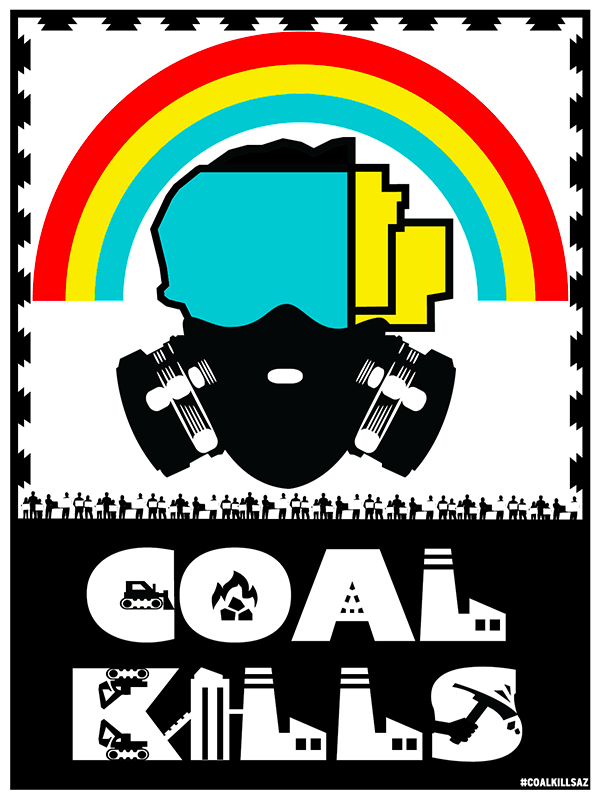This screenprint process attempted to keep messaging true to our local grassroots movement on Black Mesa, free of typical watered-down non-profit language and also culturally considerate to avoid using death or its imagery. These obstacles in telling our struggle as Diné from that region are a direct reflection of our lived experiences battling colonialism and environmental destruction.