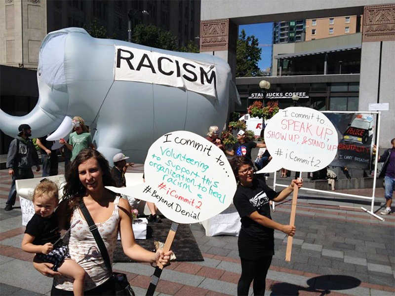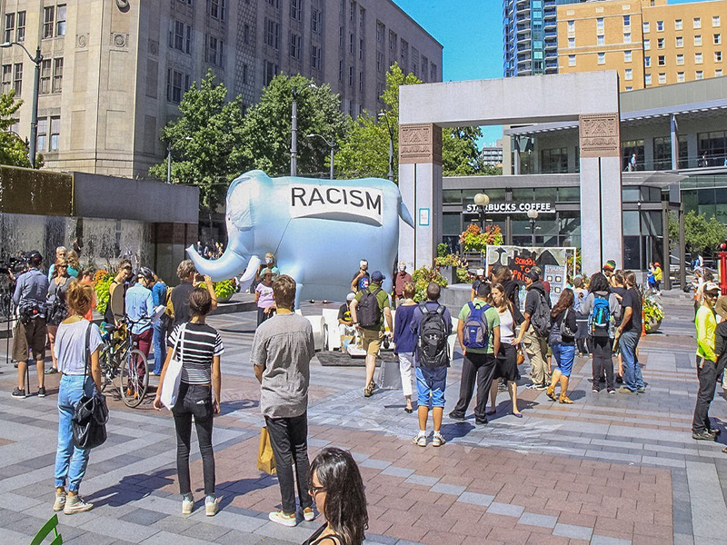 In August of 2015 in downtown Seattle, a city square was presented with a giant inflatable pachyderm with the word, “RACISM” on it. The whole city was invited into a living room scene to have some direct conversations about racism, the literal elephant in the room in white people’s lives. It’s important to note that these art installations were deployed specifically where #BlackLivesMatter took the stage to confront Bernie Sanders during his presidential campaign run.