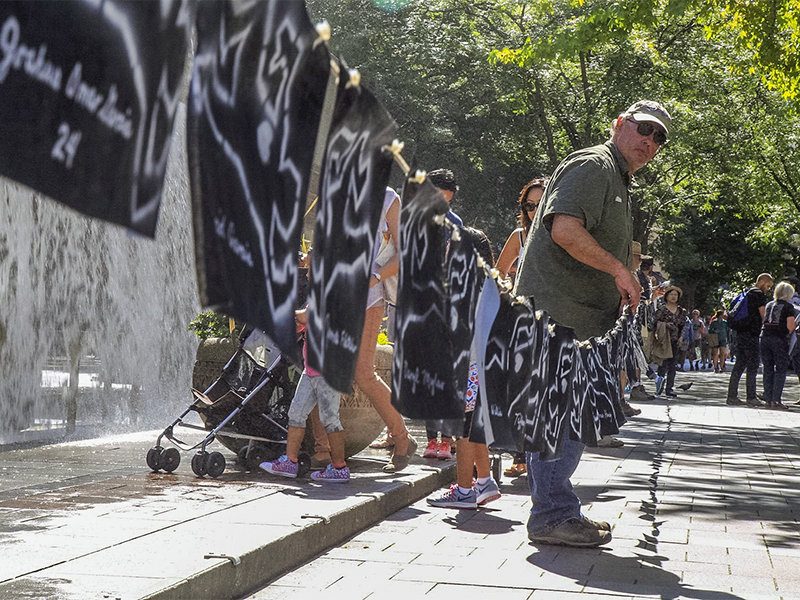 Another component of this action against racism was creating a memorial for the 736 people who had been murdered by police since January 2015. The victims were represented by a white chalk stenciled outline along with a broken heart and their names written below. The local pedestrians were forced to engage in an overtaken sidewalk, lined on both sides with a memorial of the hundreds of people who were killed by cops.
