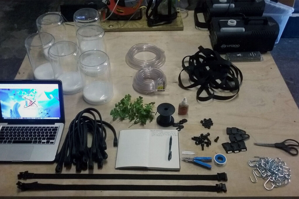 The ominous scene is created by local frontline families who are dressed in hazmat suits and Clean Air Respirators. These optics are reinforced by the visceral imagery of having children with smaller suits and respirators playing on a swing set and also in a sandbox. This subversively sinister theater is enhanced by attaching smoke machines to existing fracking rig props and tipped-over barrels labeled “Benzene”. These props also smoke and leak what resembles spilled fracking waste. This subconscious nonverbal communication is a powerful conclusion that auction attendees make on their own by connecting their participation in the eventual destruction of the environment for future generations. It should be noted that these technical visual additions are non-toxic and safe.