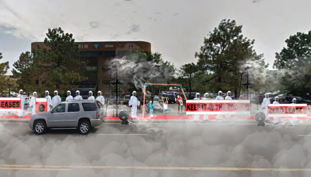 This particular case study considers targeting attendees to the Bureau of Land Management (BLM) auctions of Indigenous land to be fracked and poisoned by oil and gas for literal pennies on the dollar. The proposal presented was an escalation of visuals to support community tactics. This scene would help create a spectacle of urgency to end lease sales by foreshadowing the environmental impacts on local families by hydraulic fracking at the entrance of the auction.